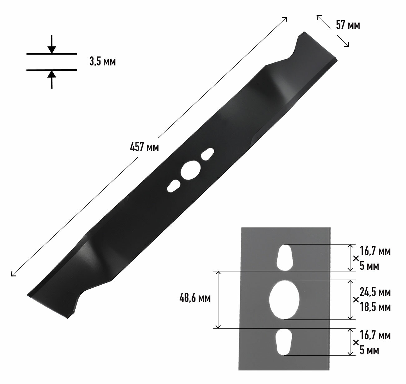 Нож PATRIOT MBS 461 для газонокосилок PT47LM, PT47LS, РТ47BS / длина ножа 457 мм / посадочное отверстие 16,7х5 мм