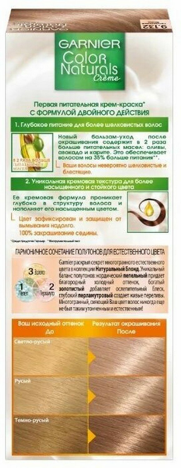 Ниже Вы можете прочитать отзывы на Garnier Стойкая крем-краска для волос Color Naturals, тон 9.132 Натуральный блонд, 110 мл, 3 шт, ознакомится с подробными характеристиками, посмотреть интересные обзоры и фотографии на Garnier Стойкая крем-краска для волос Color Naturals, тон 9.132 Натуральный блонд, 110 мл, 3 шт.