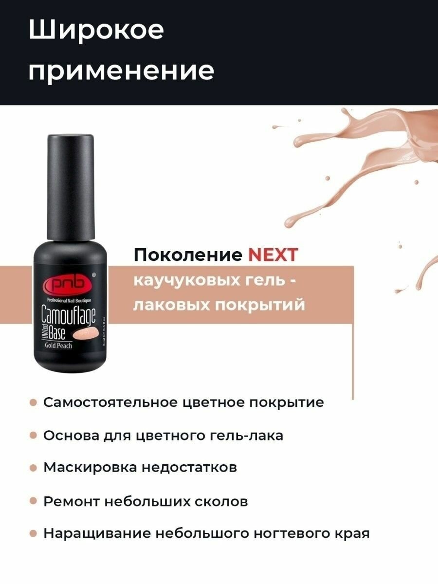 PNB Camouflage Base цветная камуфлирующая каучуковая база для ногтей и гель-лака с шиммером UV/LED золотисто-персиковая 30 мл