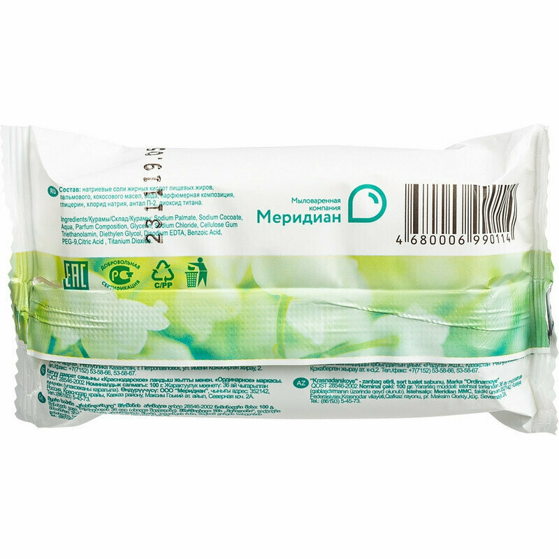 Мыло кусковое туалетное Меридиан "Краснодарское. Ландыш", 90г, флоу-пак, 1шт.