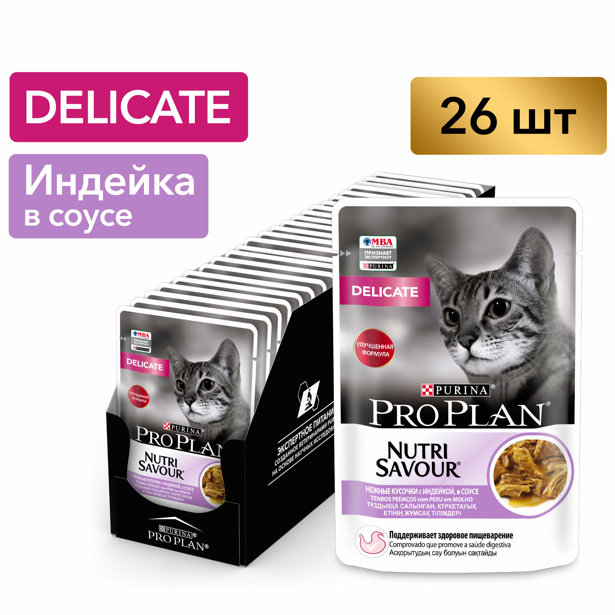 Корм для кошек PRO PLAN Delicate с чувствительным пищеварением, с индейкой в соусе пауч 85г (упаковка - 26 шт)