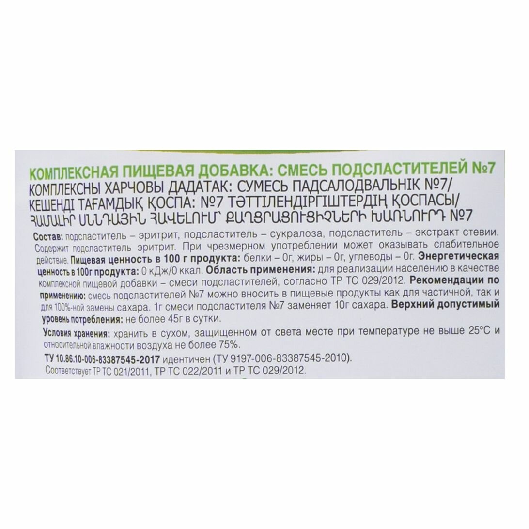 | Дополнительная информация | хранить в сухом, защищенном от света месте при температуре не выше 25°С и относительной влажности воздуха не более 75%; 1 г смеси заменяет 5 г сахара; рекомендуемая дозировка: не более 45 г в сутки; при чрезмерном употреблении может вызвать послабляющее действие |