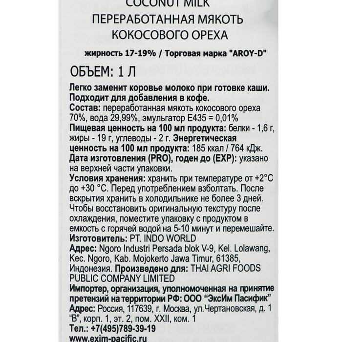 Молоко Aroy-D кокосовое 70%, жирность 17-19%, 1 л