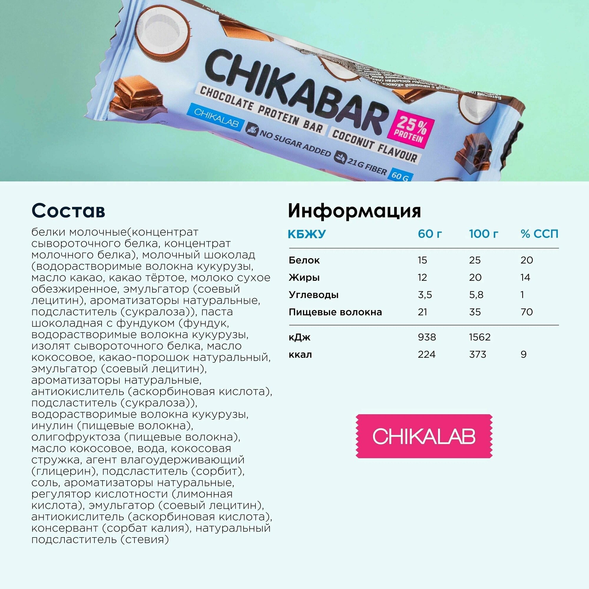 Протеиновый батончик Chikalab Chikabar 20 шт x 60 г, Кокос