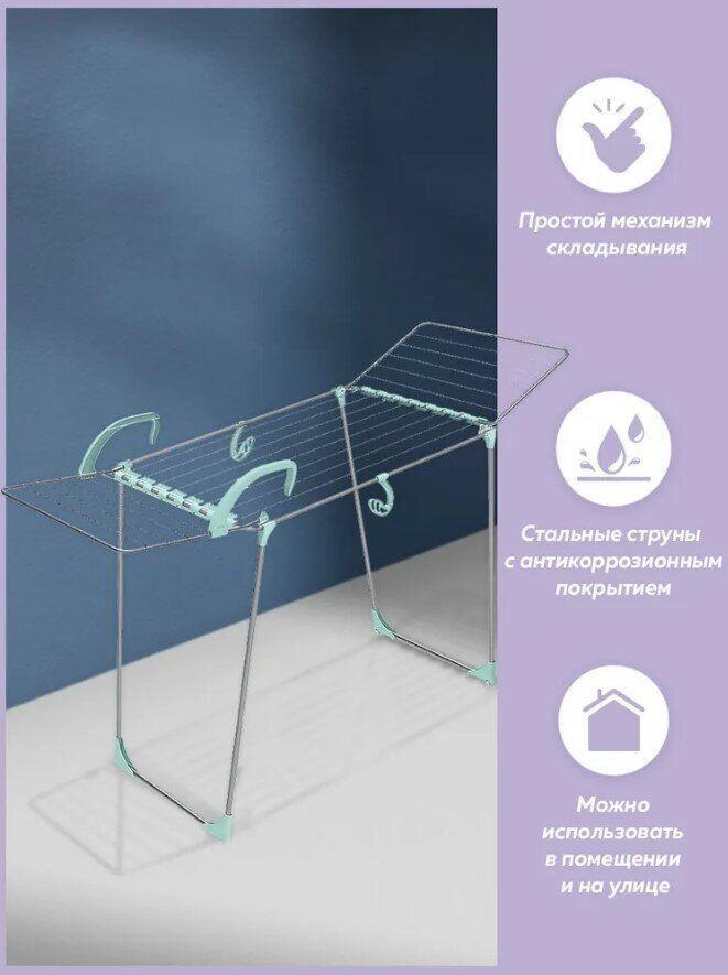 Сушилка для белья напольная складная, серебряный, 3 зоны, до 15 кг. Пластмассовые наконечники на струнах обеспечивают дополнительную устойчивость и предотвращают скольжение белья