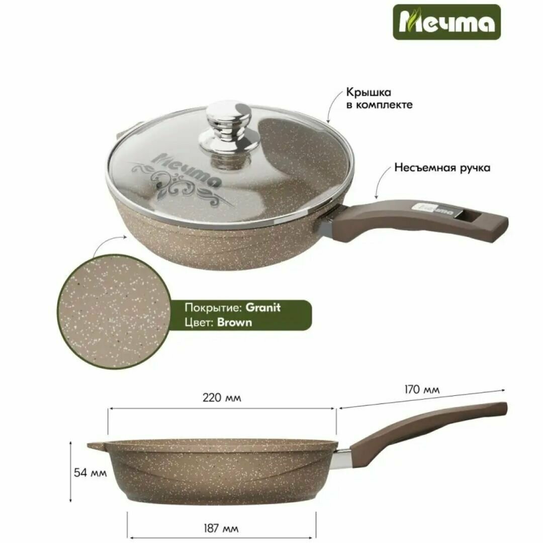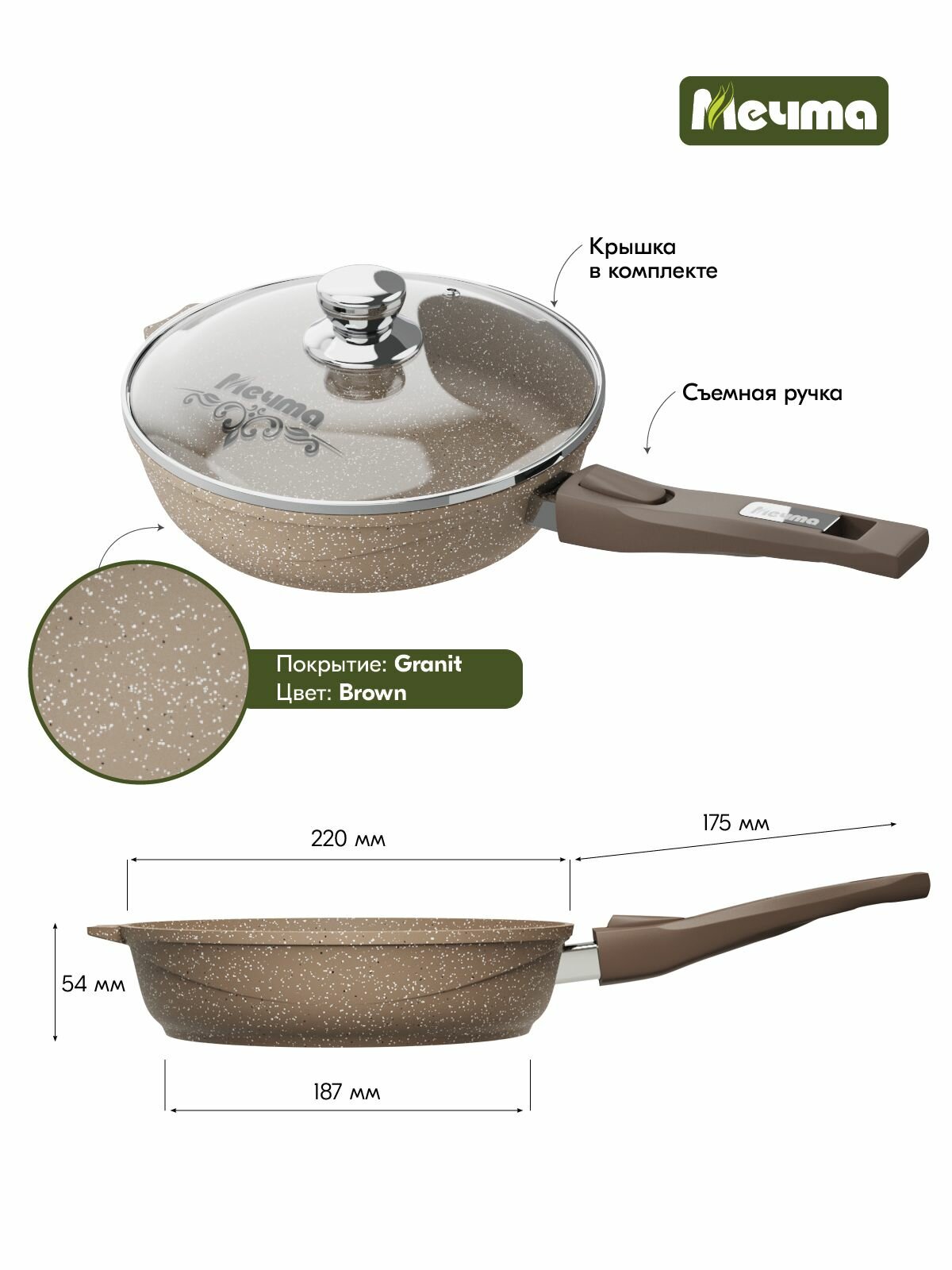 Сковорода с гранитным антипригарным покрытием крышкой и съемной ручкой 26 см Мечта