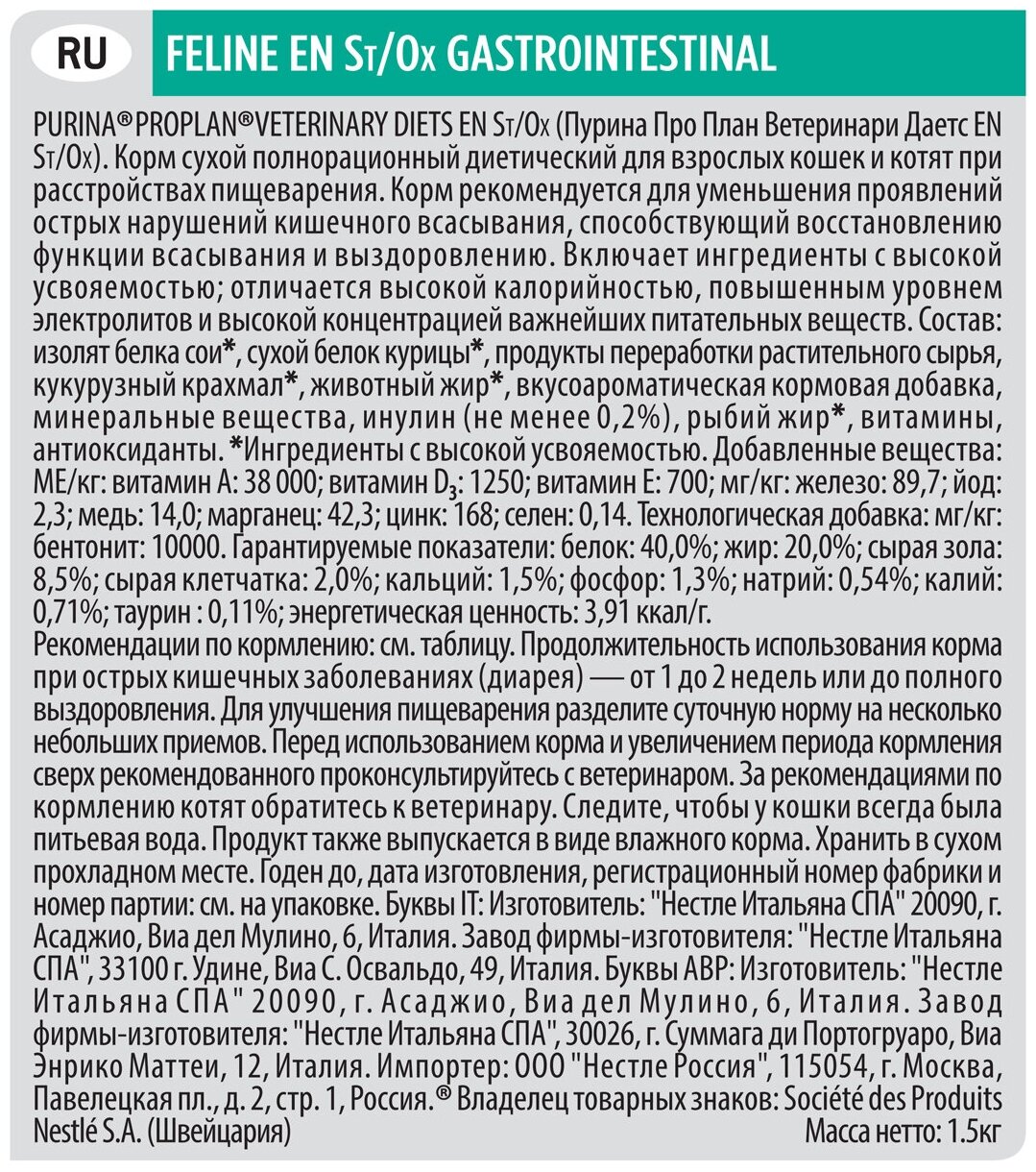 Сухой корм Pro Plan Veterinary Diets EN St/Ox для взрослых кошек и котят для снижения проявлений острых кишечных расстройств, Пакет, 1,5 кг
