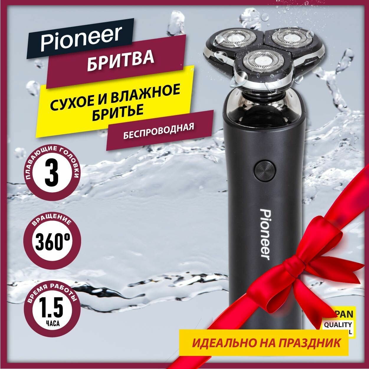 Бритва электрическая Pioneer беспроводная с USB-кабелем, 3 плавающие головки, вращение на 360 градусов