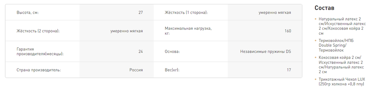 | Наполнитель | комбинированный (Натуральный латекс+Искусственный латекс+Кокосовая койра) |