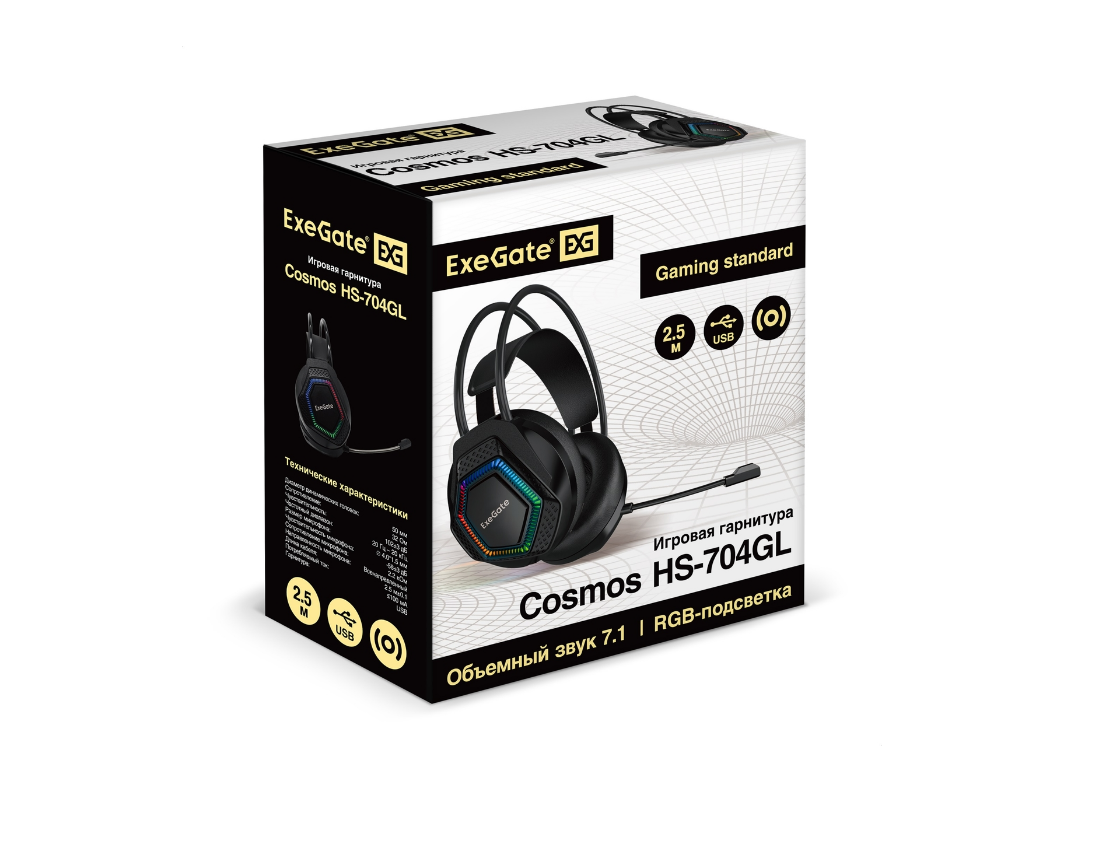 Игровая гарнитура ExeGate Cosmos HS-704GL (объемный звук 7.1, длина кабеля 2.5м, RGB подсветка, USB интерфейс, Color Box)