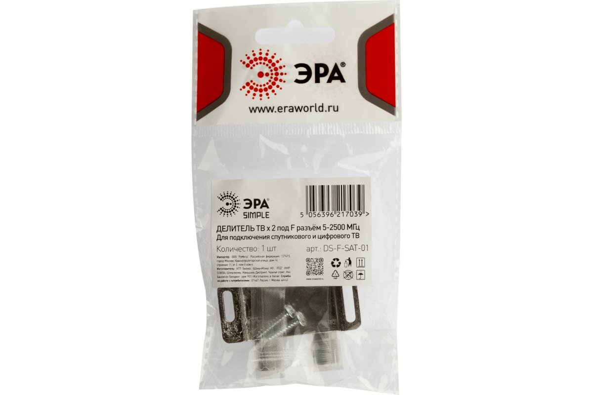 Делитель ТВ ЭРА Simple DS-F-SAT-01 2 ответвления под F разъём 5-2500 МГц арт. Б0048329 (1 шт.)