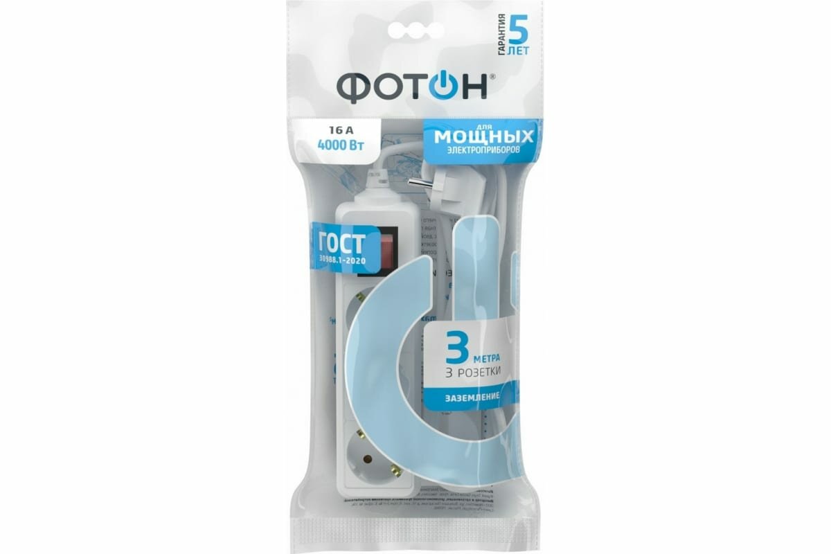 Удлинитель сетевой для розетки фотон 16А 3 метра 3 розетки с выключателем с заземлением белый, ГОСТ