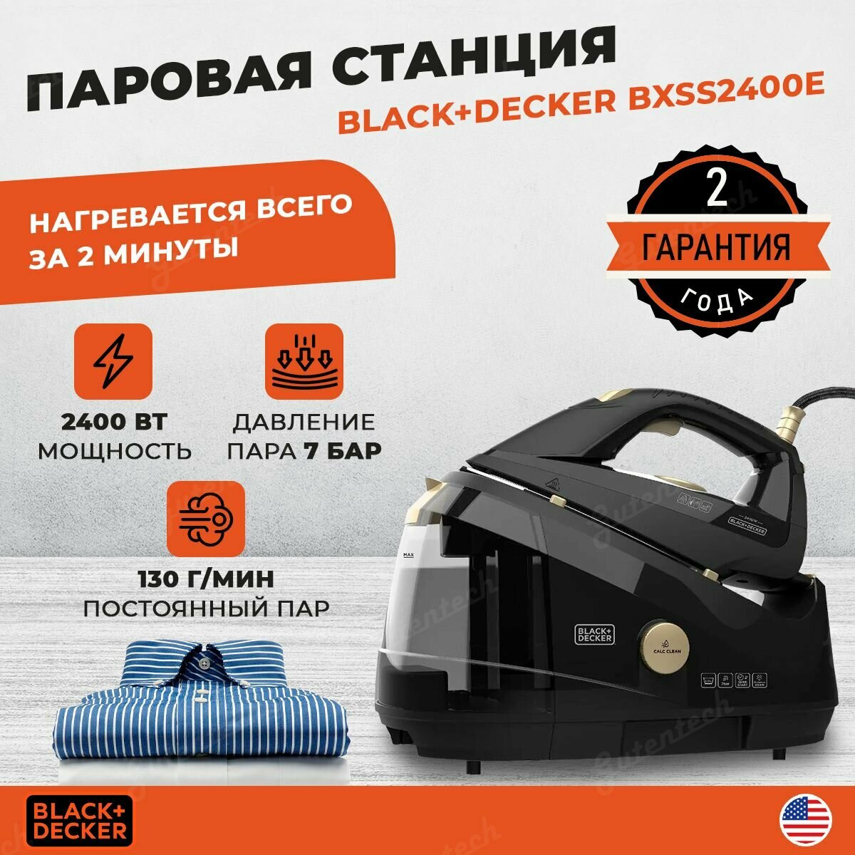 Паровая станция Black+Decker BXSS2400E / давление пара 7 бар / 130 г/мин постоянный пар / нагревается за 2 минуты / чёрный интересное: