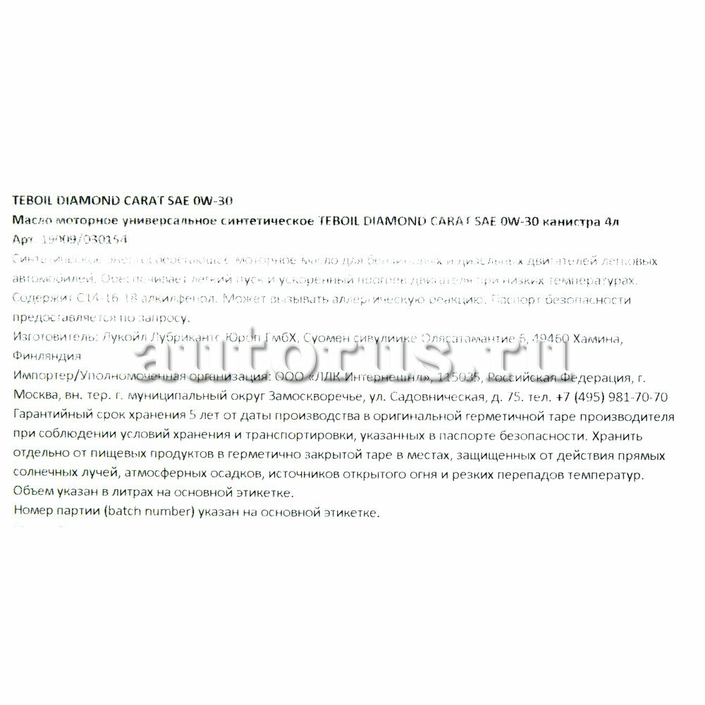 Масло Моторное Teboil Diamond Carat 0w-30 Синтетическое 4 Л 19009 Teboil арт. 19009