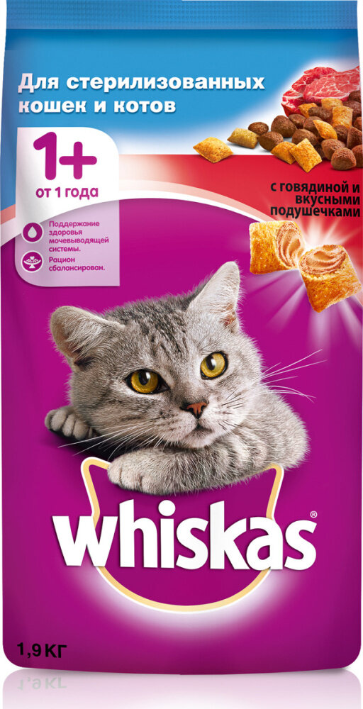 Корм сухой Whiskas для взрослых стерилизованных кошек, с говядиной и вкусными подушечками, 1,9 кг
