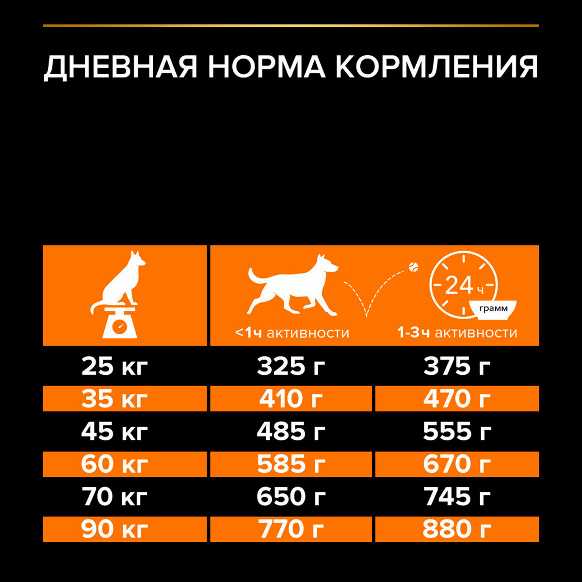 | Дополнительная информация | используйте таблицу для определения суточной нормы кормления вашей собаки; указанные нормы рекомендованы для поддержания собаки в оптимальной физической форме; меняйте суточную норму кормления в зависимости от уровня активности собаки, ее физических особенностей и индивидуальных потребностей; следите, чтобы у собаки всегда была чистая, свежая питьевая вода; для контроля здоровья вашей собаки обращайтесь в ветеринарную клинику на регулярной основе |