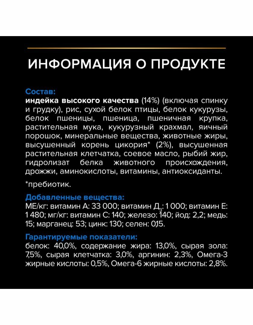 | Состав | индейка 14%, сухой белок птицы, рис, кукурузный глютен, пшеничный глютен, пшеница, волокна пшеницы, продукты переработки растительного сырья, кукурузный крахмал, яичный порошок, животный жир, рыбий жир, сухой корень цикория, масло соевое, минеральные вещества, витамины, рыбий жир, вкусоароматическая кормовая добавка, дрожжи, антиоксиданты |