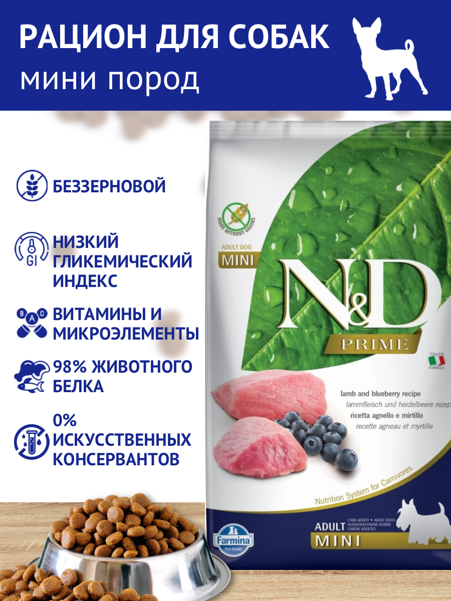 Сухой беззерновой корм Farmina N&D Prime Dog Mini для собак мелких пород, с ягненком и черникой, 800 г