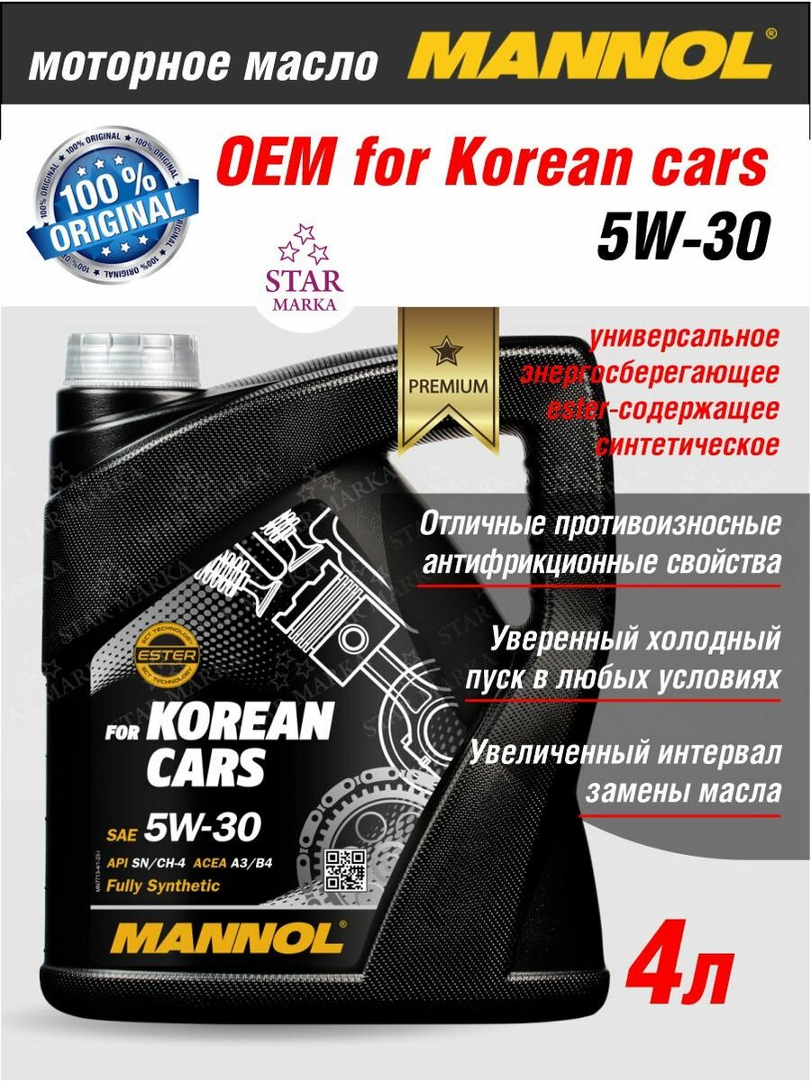 Масло моторное mannol 7713 o.e.m. for korean cars 5w-30 синтетическое 4 л 7030