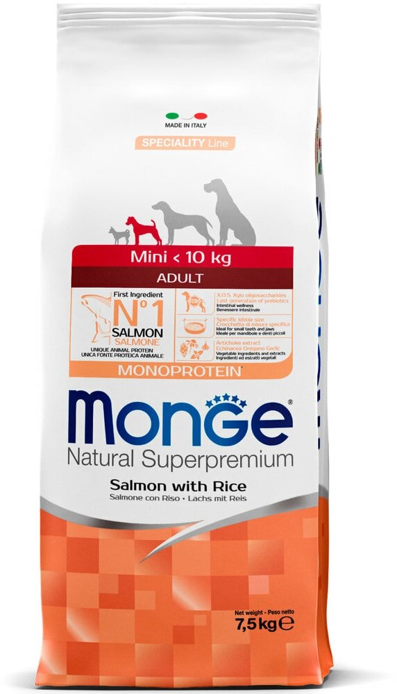 Сухой корм Monge Dog Speciality Line Monoprotein Mini для взрослых собак мелких пород, из лосося с рисом, 7,5 кг