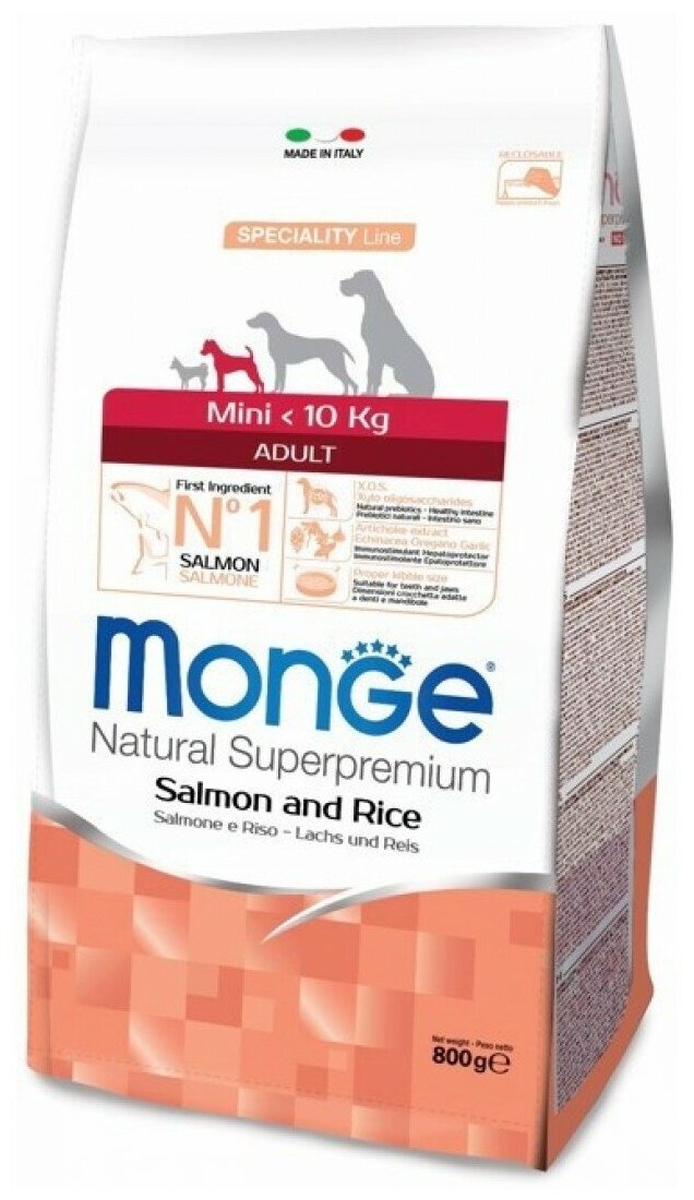 MONGE SPECIALITY DOG MINI ADULT SALMON для взрослых собак маленьких пород с лососем и рисом (0,8 кг)