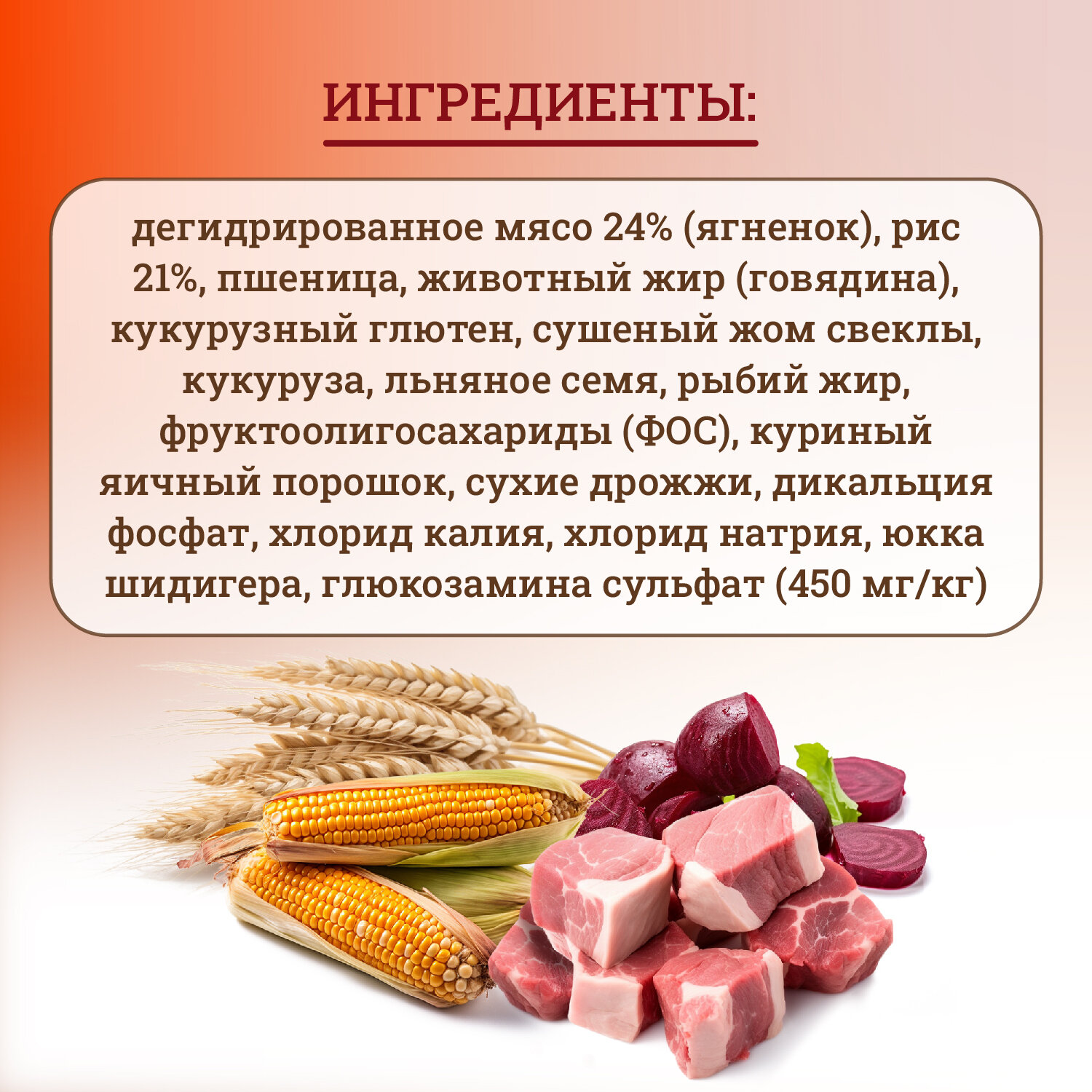 | Состав | дегидратированное мясо ягненка (ягненок 24%), рис 21%, пшеница, животный жир, кукурузный глютен, сушеный жом свеклы, кукуруза, льняное семя, рыбий жир, фруктоолигосахариды (ФОС), сушеное яйцо, сухие дрожжи, дикальция фосфат, калия хлорид, натрия хлорид, юкка шидигера, глюкозамин, биологический комплекс растительных экстрактов 0.03% (гвоздика, цитрусовые, виноградная лоза, розмарин, куркума) |