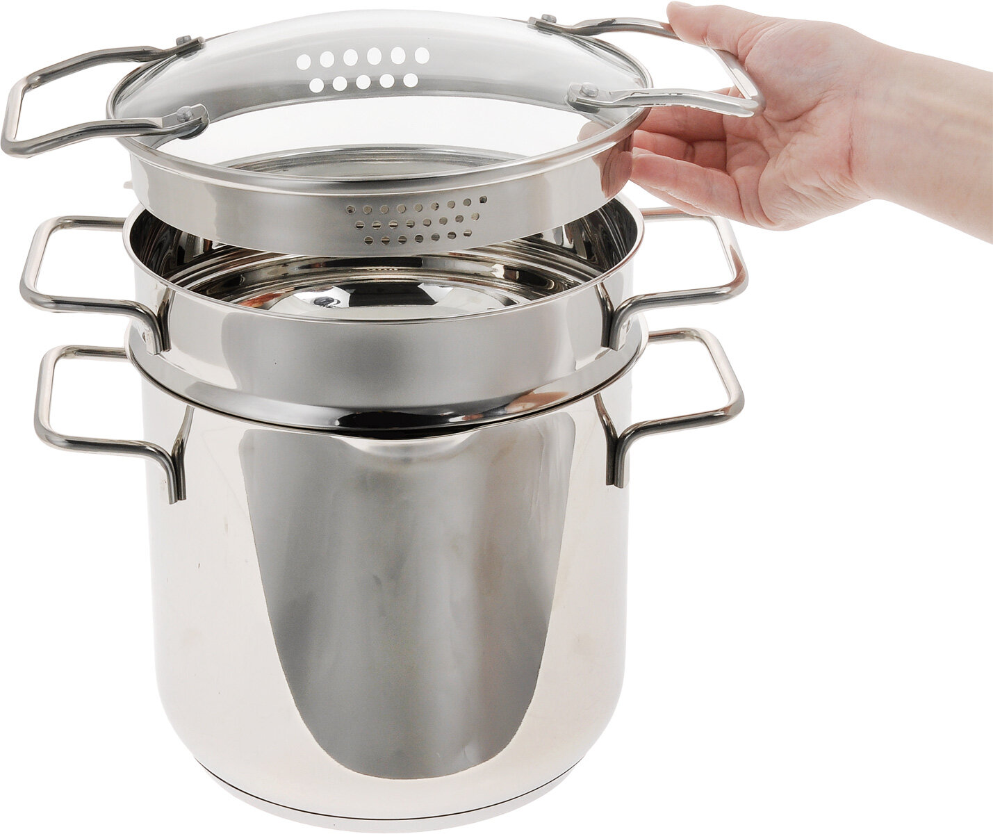 | Комплектация | кастрюля: 20 см; пароварка: 20 см; крышка; тарелки: 27 см (6 шт.); миска для салата: 31 см; миска для соуса: 14 см; терка с силиконовым кольцом: 15 см; вилки: (6 шт.); щипцы для макарон: 27 см |