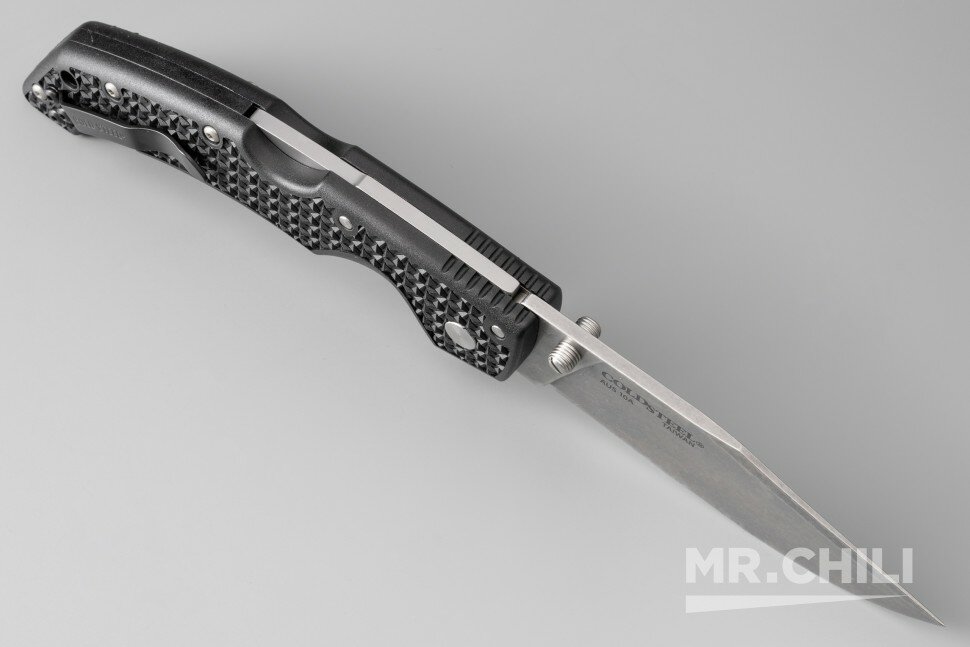 | Минусы: | Классический тип замка исключает возможность закрывания ножа одной рукой. Можно, конечно, пытаться закрывать на обратном хвате, но без должного навыка это медленно и чревато травмой. Сталь очень непростая, требует грамотного подбора абразивов и техники заточки. Угол заточки ножа из коробки годится только для рубки дров, как всегда у колдстиловских ножей, для использования ножа по назначению необходимо переточить. |