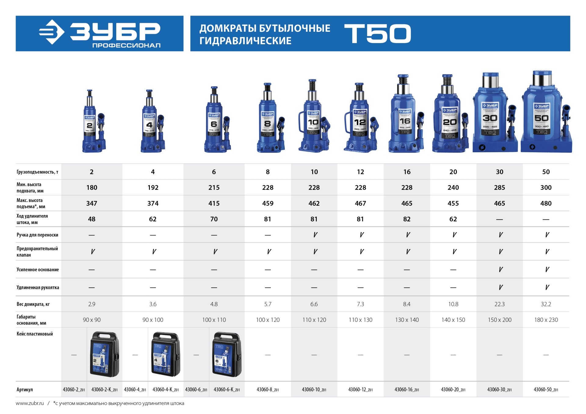 ЗУБР Домкрат гидравлический бутылочный T50, 2т, 180-347мм, Профессионал 43060-2 43060-2_z01
