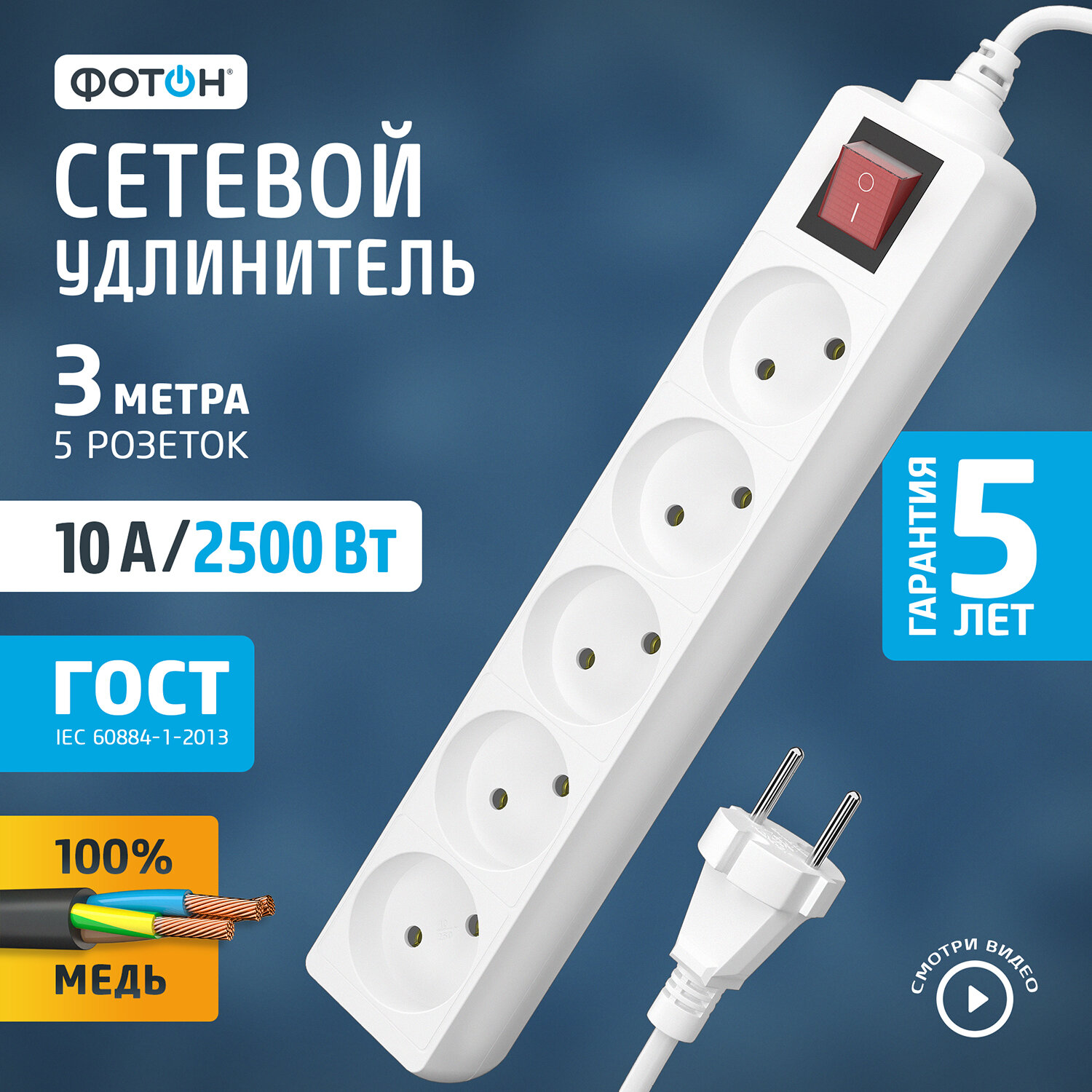СохранитьУдлинитель сетевой для розетки фотон 10А 3м 5 розеток с выключателем белый, ГОСТ интересное: