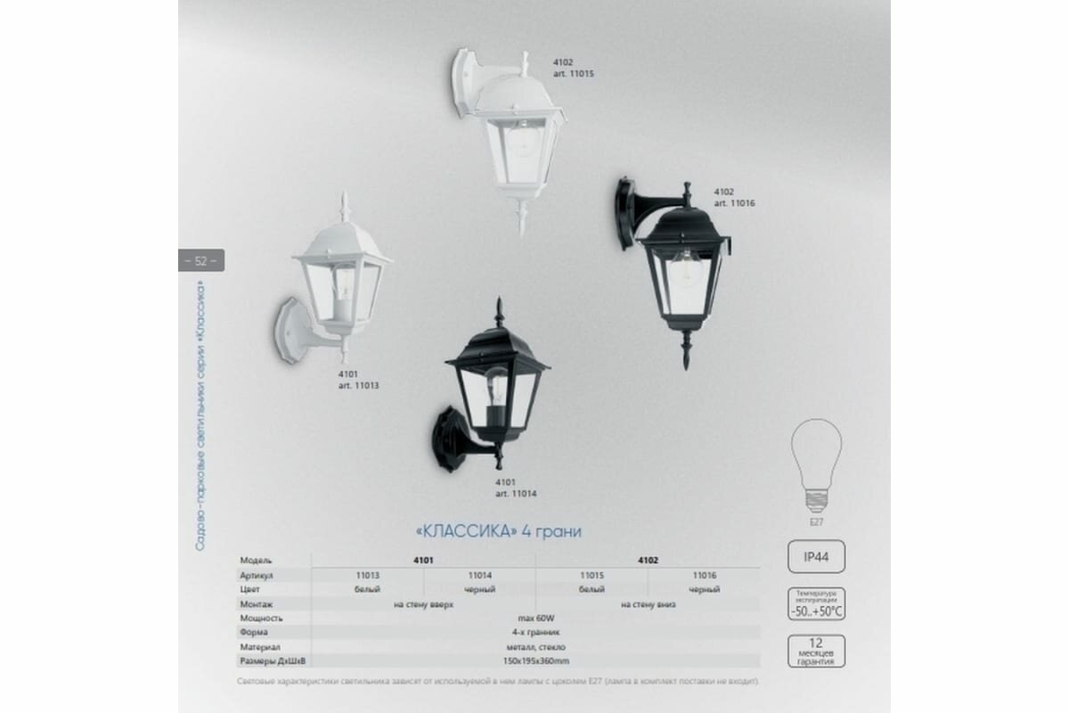Светильник садово-парковый 60W E27 белый, на стену вниз 4102