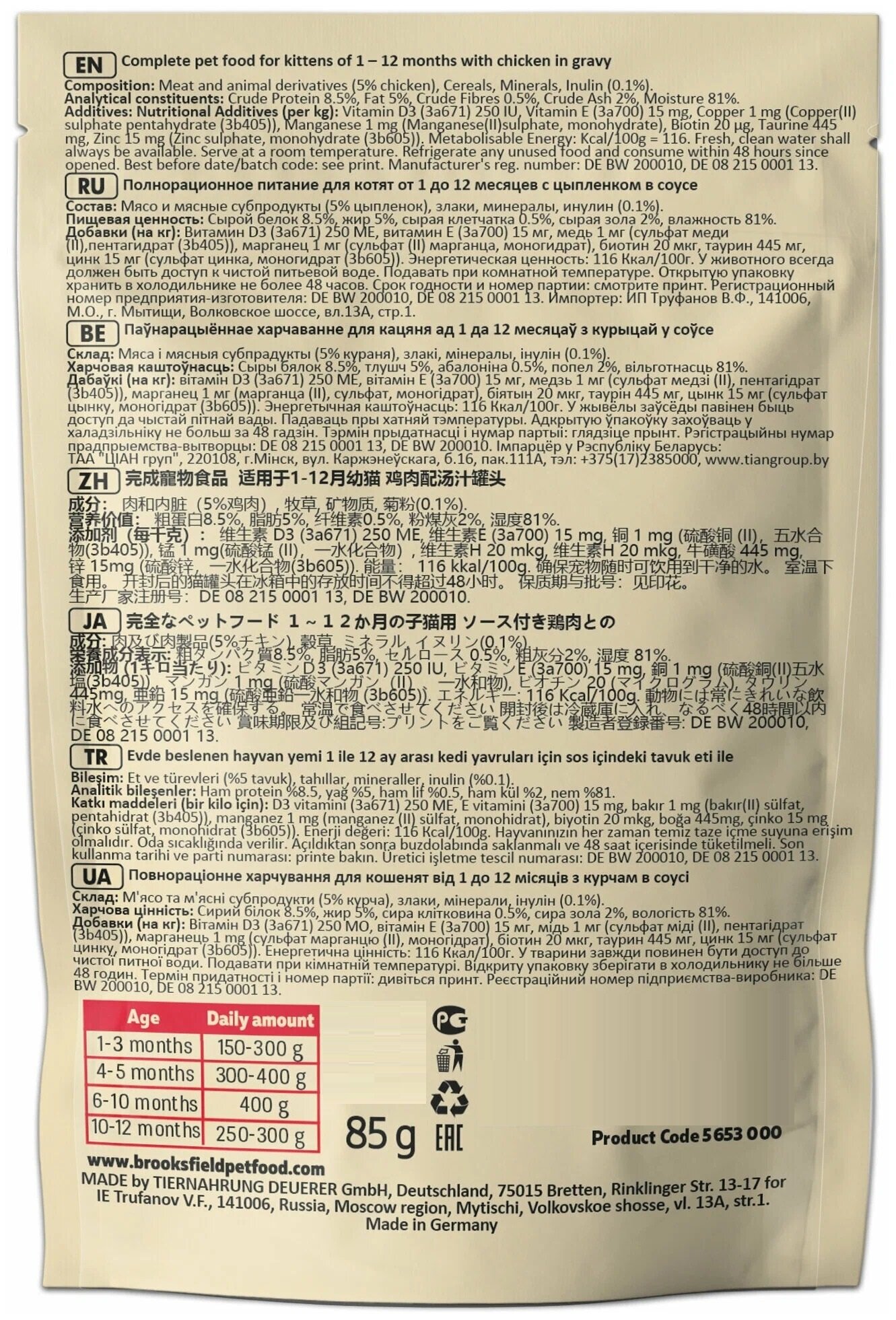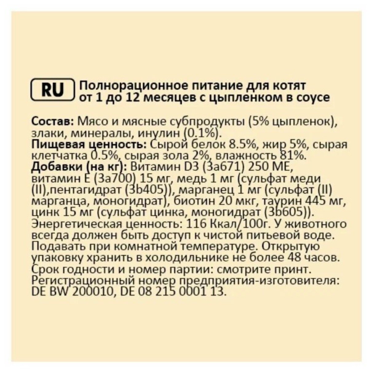| Витамины | на кг: D3 (3a671) 250 МЕ, Е (3a700) 15 мг, биотин 20 мкг |