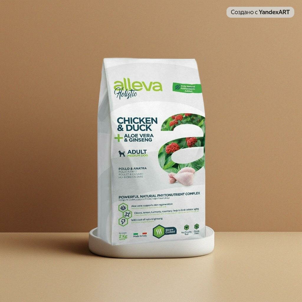 ALLEVA HOLISTIC DOG для собак Adult Chicken Duck Medium / взрослых с курицей и уткой, алое вера и женьшенем 12кг 2400, (1 шт)