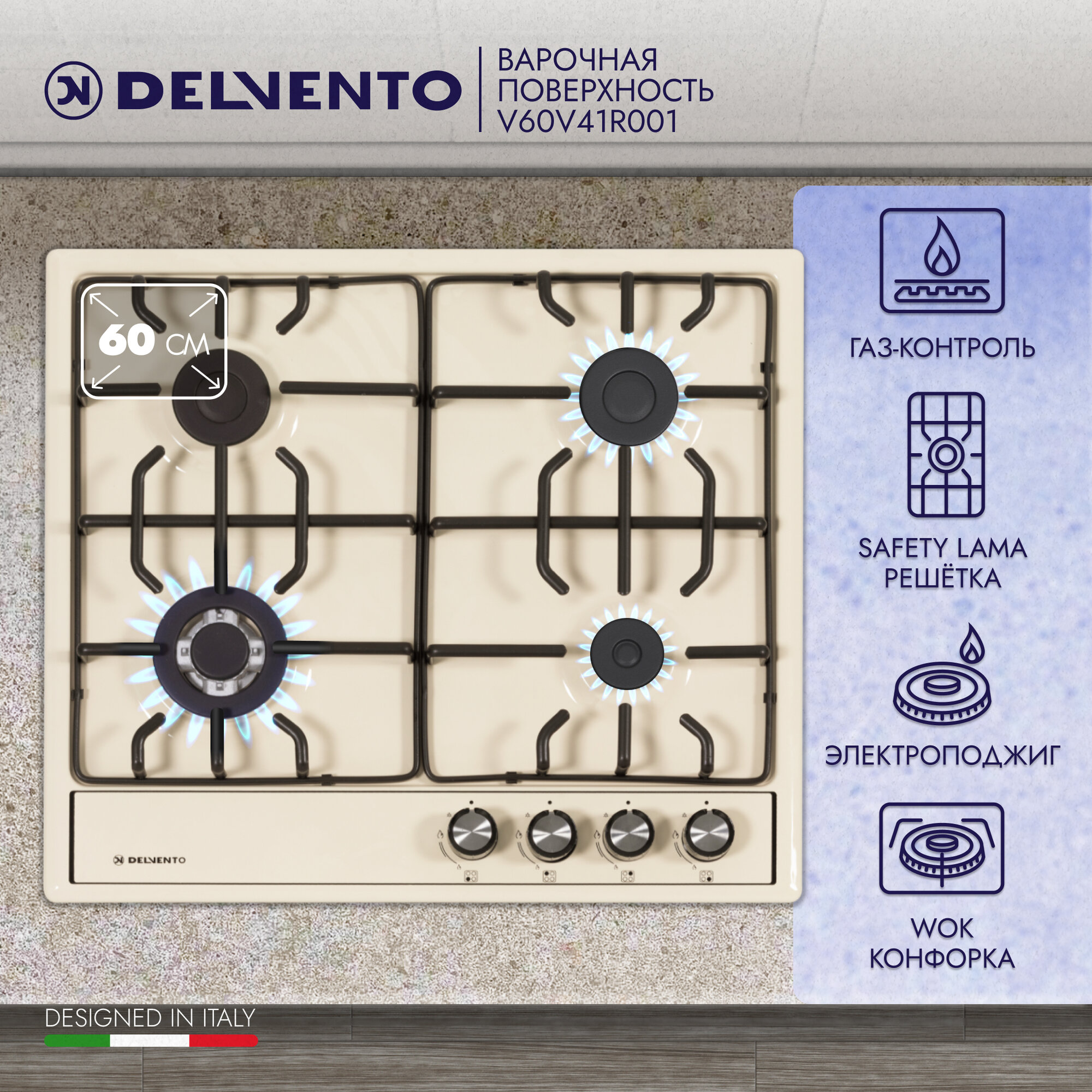 Варочная панель газовая DELVENTO - V60V41M001 - 60 см, Газ-контроль, WOK-конфорка, фронтальная панель управления, safety решетка, жиклеры для баллонного газа, полный комплект, 3 года гарантии