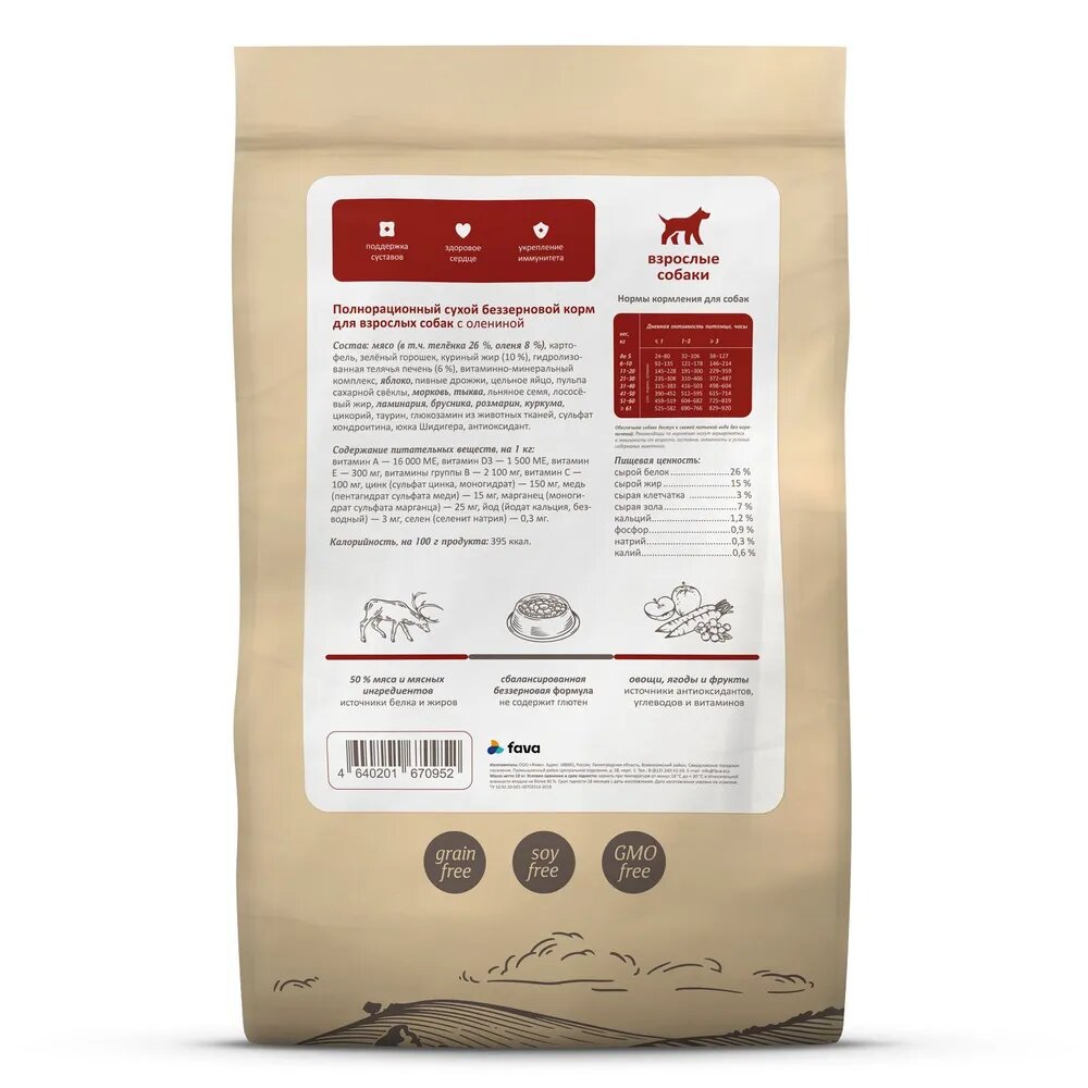 | Состав | мясо (в т.ч телёнка 26%, оленя 8%), картофель, зелёный горошек, куриный жир, витаминно-минеральный комплекс, яблоко, пивные дрожжи, цельное яйцо, пульпа сахарной свёклы, морковь, тыква, льняное семя, лососёвый жир, ламинария, брусника, куркума, розмарин, цикорий, таурин, глюкозамин из животных тканей, сульфат хондроитина, юкка Шидигера. |