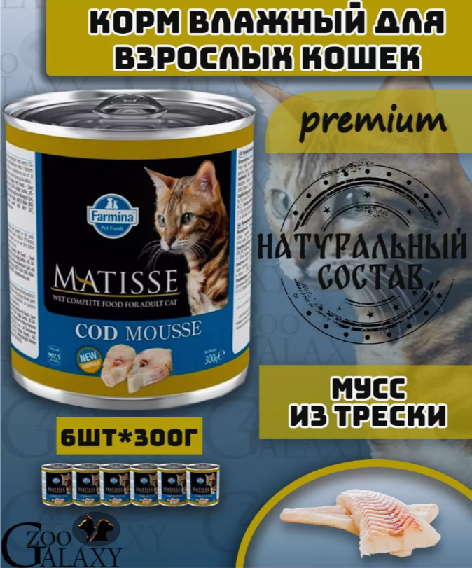 Влажный корм для кошек Farmina Matisse Codfish Mousse,треска,упаковка 6 шт х 300 гр