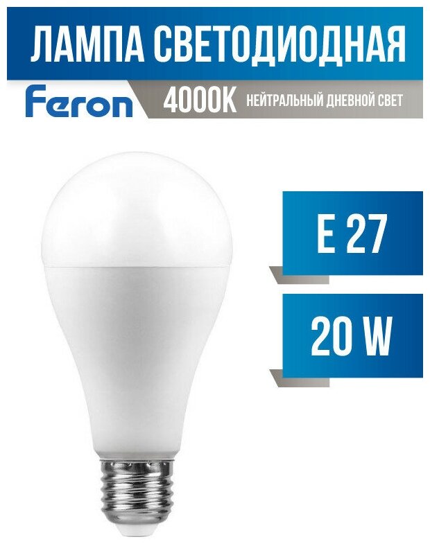 (20 шт.) Светодиодная лампочка Feron ЛОН A65 E27 20W(1800lm) 4000K 4K матовая 135x65, LB-98 25788 Нейтральный белый. Цоколь E27