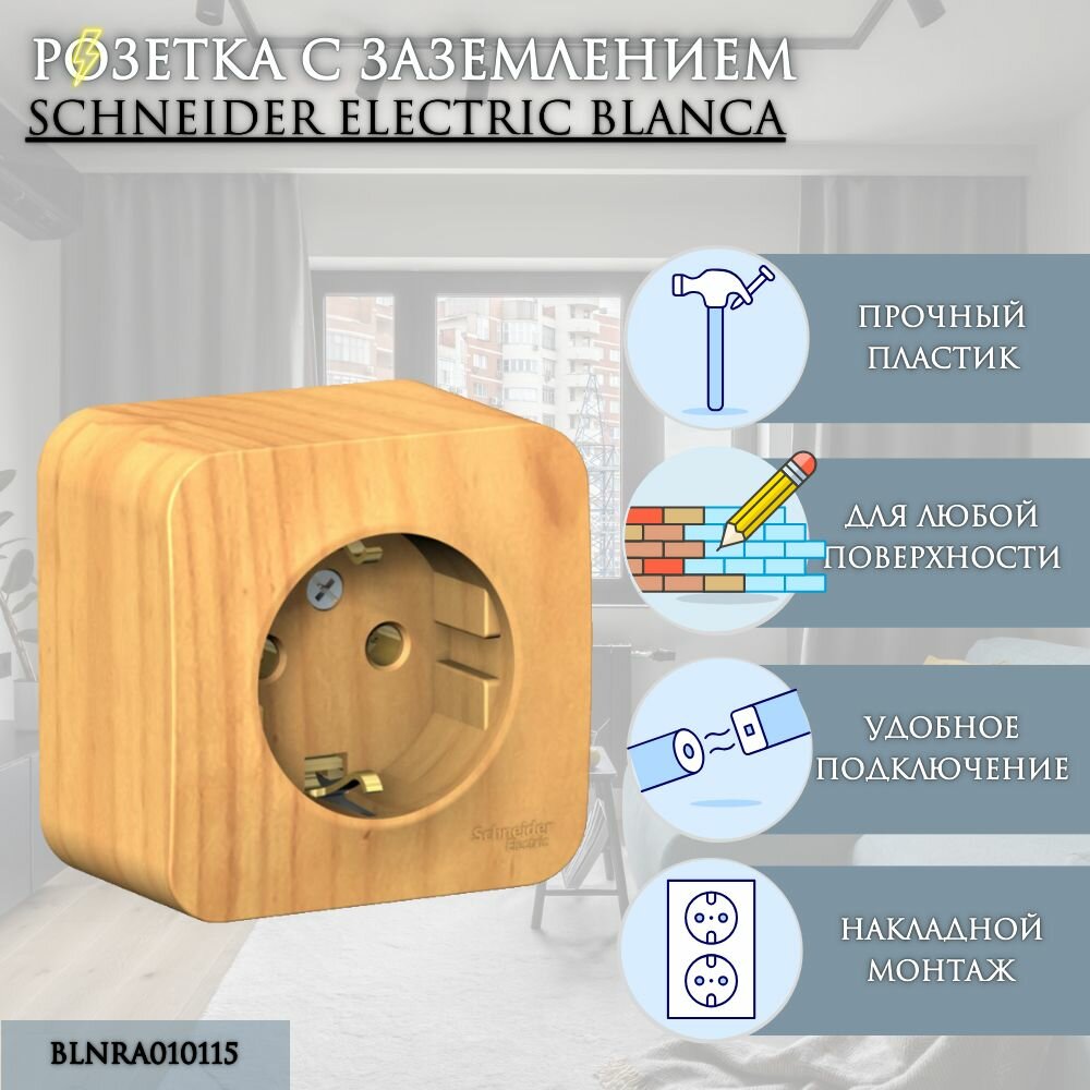 Розетка Schneider Electric Blanca с заземлением, открытый монтаж, изолирующая пластина. Ясень