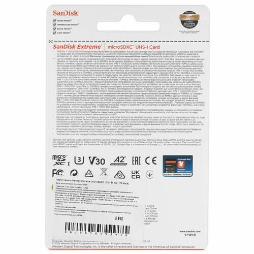 Оригинальная Карта памяти Sandisk MicroSDXC 64 Gb Extreme Class 10, UHS Class 3, UHS-I, V30, A2. 170/80Mb/s