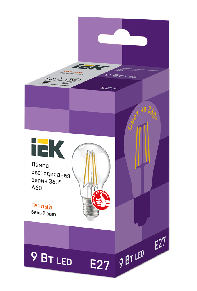 Светодиодная лампа IEK A60 9Вт 230В 4000К E27 филамент.