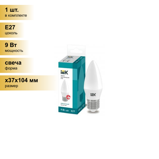 Лампа светодиодная ECO C35 свеча 9Вт 230В 4000К E27 LLE-C35-9-230-40-E27 IEK ( 1шт. )