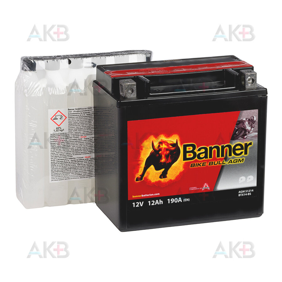 АКБ мото 12 А/часа BANNER BIKE Bull AGM-51214 12В Ток-190А 150/87/147мм Прямой YTX14-BS