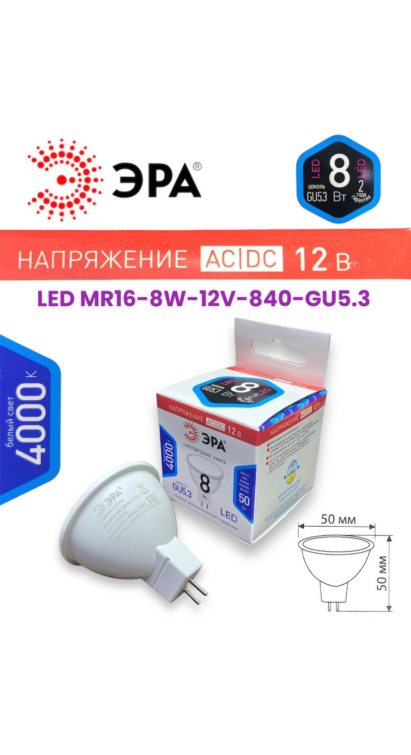 Эра Б0049094 Светодиодная лампа LED MR16-8W-12V-840-GU5.3 8 Вт софит нейтральный белый свет