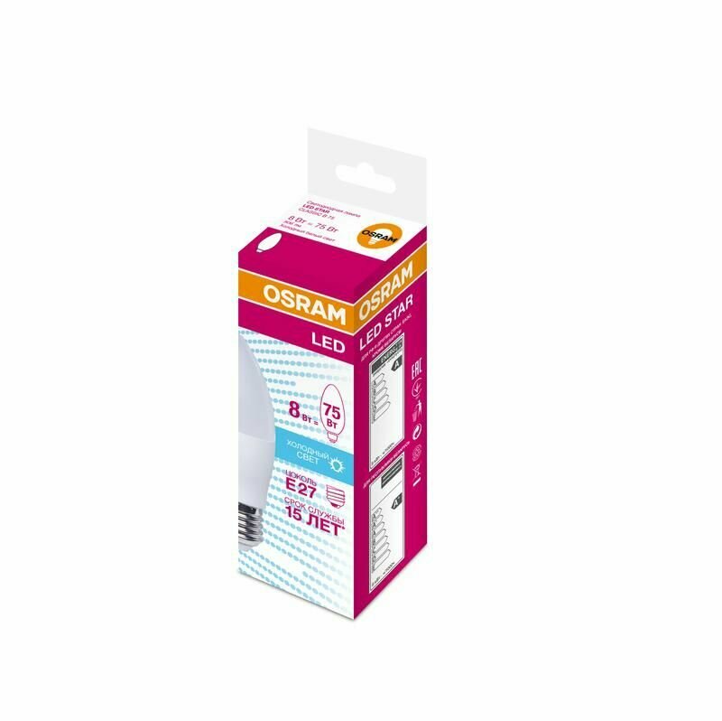 Лампочка светодиодная OSRAM Свеча B E27 8Вт 220В 806Лм 4000К Дневной белый, упаковка 1шт