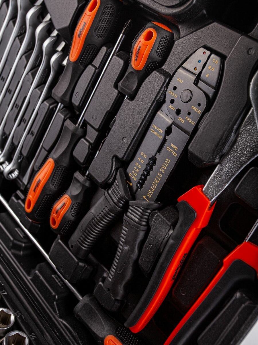 | Инструменты в комплекте | клещи переставные / ключи гаечные / ключи имбусовые (шестигранные) / молоток / отвёртки / пассатижи / рукоять для бит / трещотка |