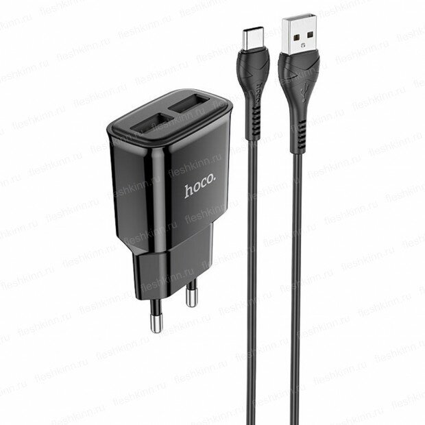 Сетевое зарядное устройство Hoco C88A, 2 USB, 2.4 А, кабель Type-C - USB, 1 м, чёрный