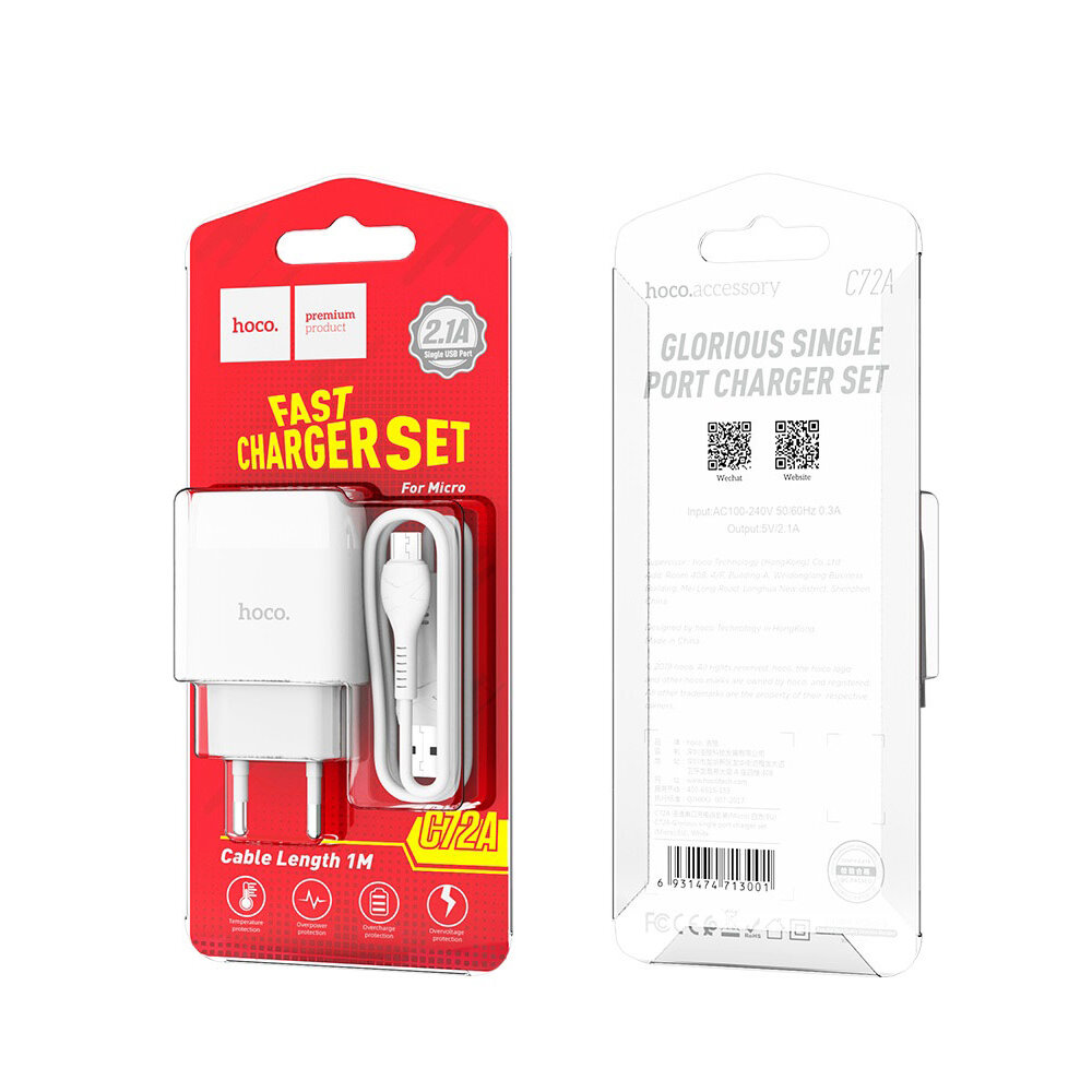 Сетевое зарядное устройство HOCO C72A Glorious 1xUSB, 2.1A + кабель MicroUSB, 1м (белый)