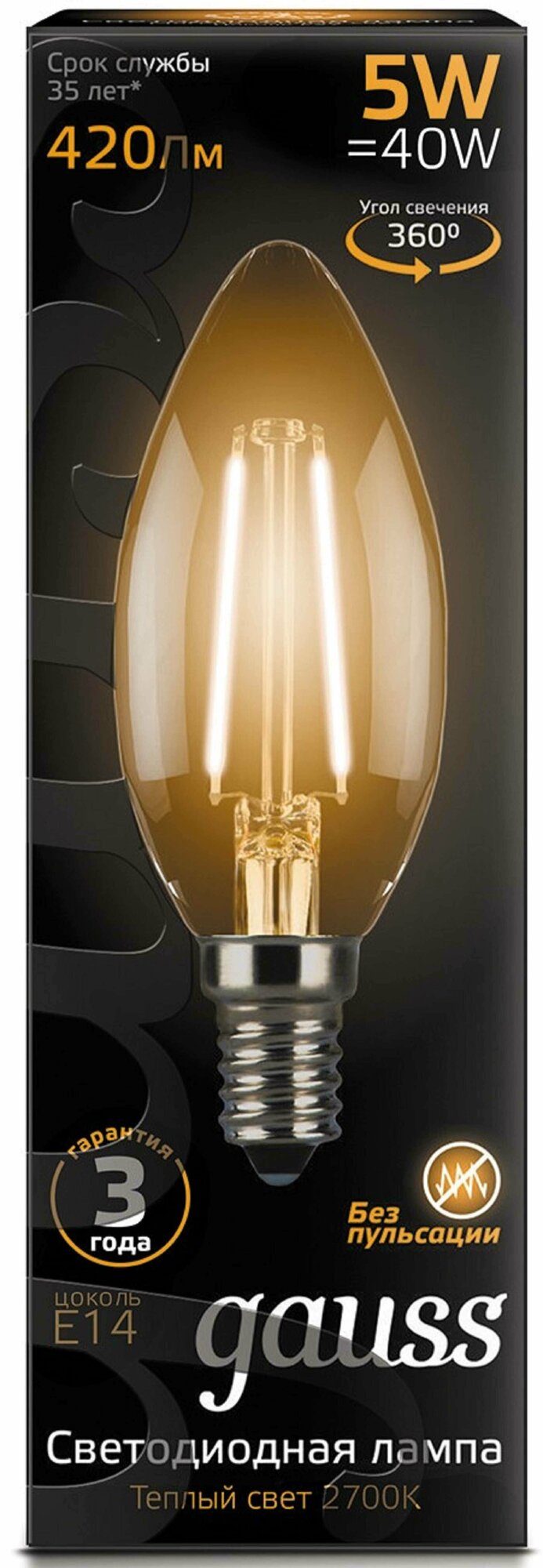 Gauss Filament Свеча E14 5W(420lm) 2700K 2K 97x35 филамент (нитевидная), прозр. 103801105 (арт. 581766)