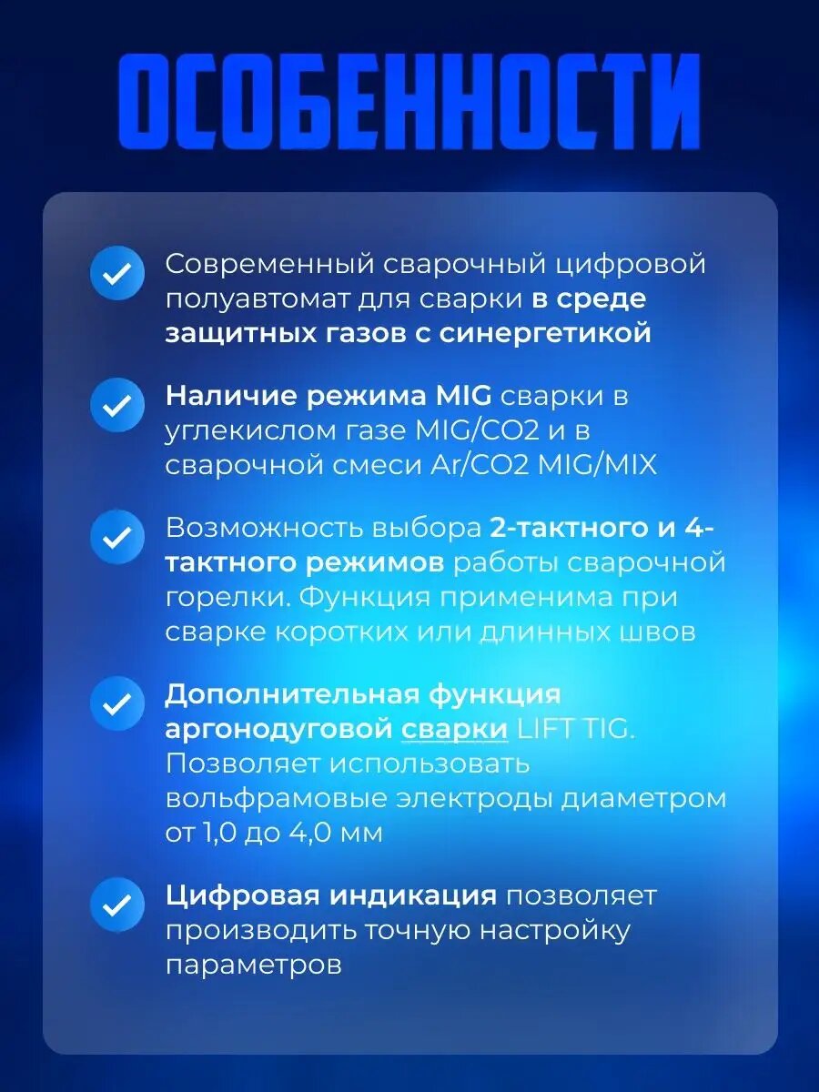 | Полуавтоматическая сварка (MIG/MAG) | есть |