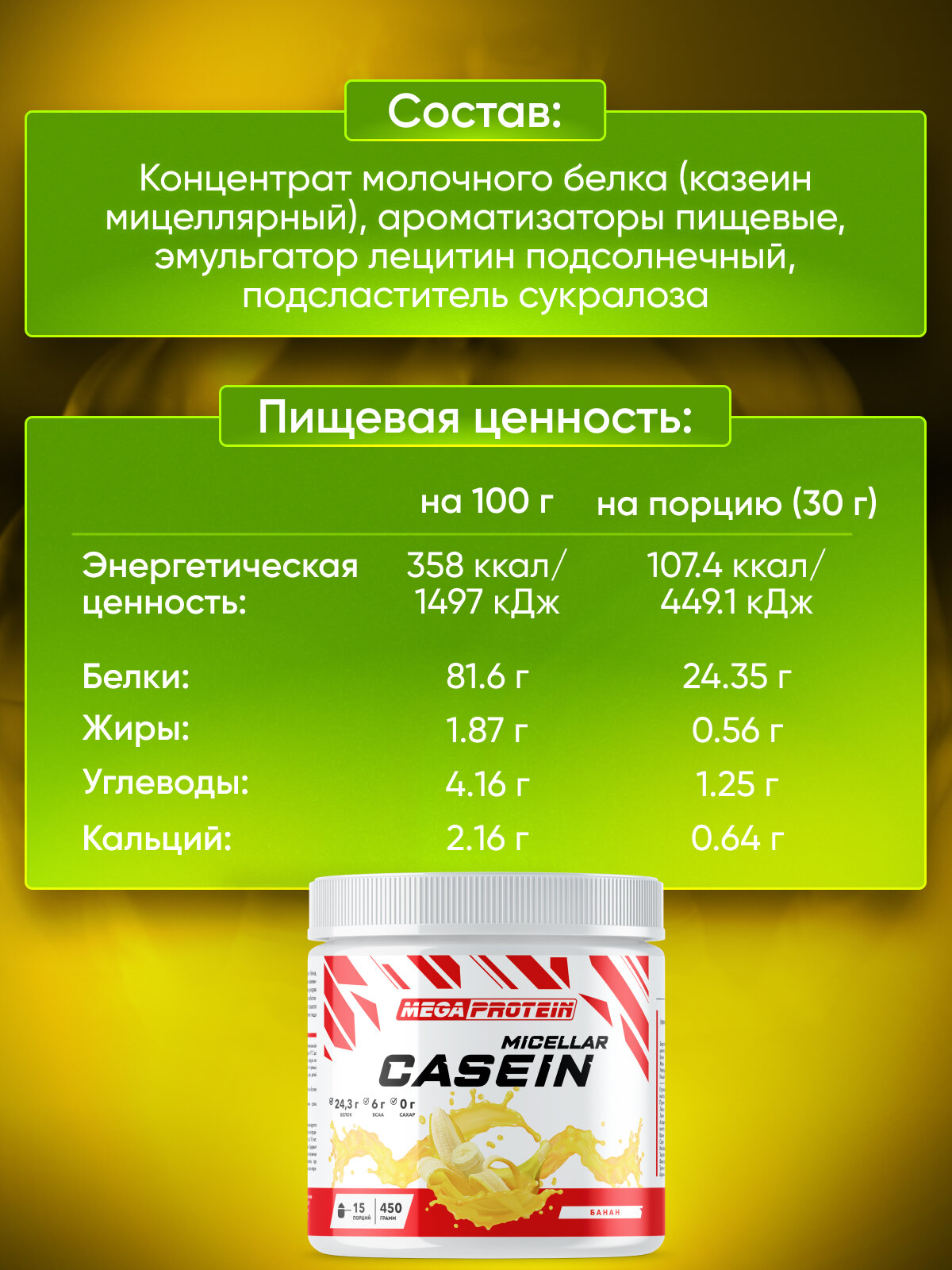 Купить Казеин мицеллярный / Казеиновый протеин "Casein micellar" со вкусом "Банан" 450 гр